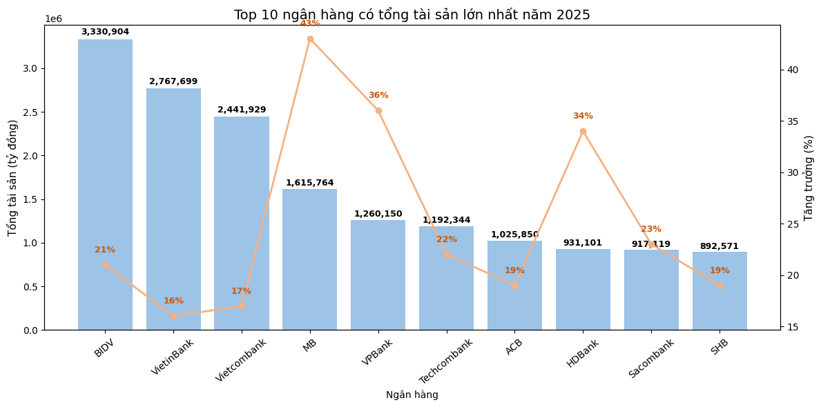 Các vị trí còn lại trong Top 10 gồm ACB, HDBank, Sacombank và SHB đều sở hữu tổng tài sản trên 800.000 tỷ đồng trong năm 2025.