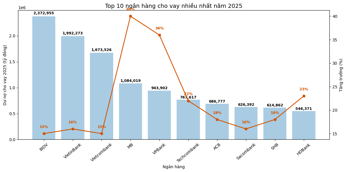 Ở mảng cho vay khách hàng, BIDV tiếp tục giữ vị trí số một trong Top 10 ngân hàng cho vay nhiều nhất năm 2025. Cụ thể, dư nợ cho vay khách hàng của BIDV đạt gần 2,4 triệu tỷ đồng, tăng 15% so với cuối năm 2024.