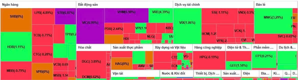 Thị trường chứng khoán Việt Nam khép lại phiên giao dịch ngày 23/12 với diễn biến tích cực trên sàn HOSE, trong bối cảnh nhóm cổ phiếu vốn hóa lớn, đặc biệt là “họ” Vingroup, đóng vai trò dẫn dắt chính. Dù độ rộng thị trường vẫn nghiêng về phía tiêu cực, chỉ số VN-Index vẫn duy trì được đà tăng mạnh nhờ lực kéo tập trung ở một số mã trụ.