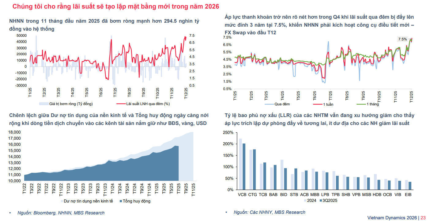 Theo báo cáo Triển vọng Việt Nam 2026 của Chứng khoán MB (MBS), Interest Rate" data-glossary-def="Mức lãi mà ngân hàng trả cho người gửi tiền, phụ thuộc vào kỳ hạn và số tiền gửi.">lãi suất huy động kỳ hạn 12 tháng được dự báo có khả năng tăng thêm khoảng 0,5 điểm % trong năm 2026, dưới tác động đồng thời của nhu cầu vốn lớn, chênh lệch kỳ hạn huy động - cho vay và áp lực NHNN.">nợ xấu trong hệ thống ngân hàng.