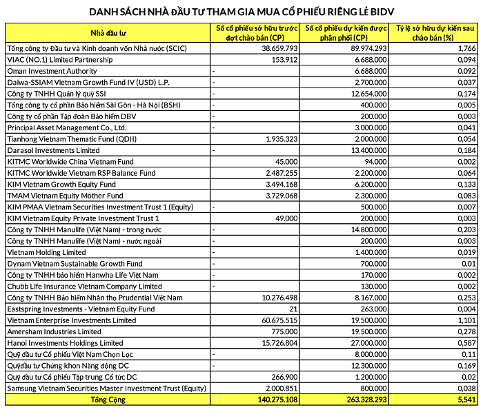 (Banker.vn) BIDV dự kiến phát hành hơn 263,3 triệu cổ phiếu với giá chào bán 38.900 đồng/cổ phiếu cho 31 nhà đầu tư chứng khoán chuyên nghiệp với tên tuổi lớn trên thị trường.