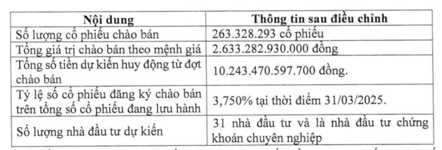 Tổng giá trị phát hành theo mệnh giá đạt 2.633 tỷ đồng; tổng số tiền dự kiến huy động lên tới hơn 10.243 tỷ đồng. Thời gian thực hiện dự kiến trong quý I. Cổ phiếu chào bán riêng lẻ sẽ bị hạn chế chuyển nhượng 1 năm.