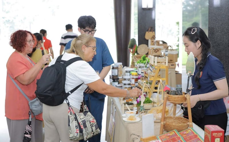 Du khách quốc tế thích thú với sản phẩm dự án khởi nghiệp tại sự kiện. Ảnh: Minh Khuê.