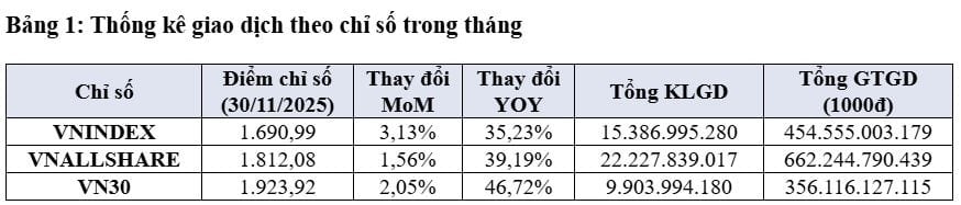 (Banker.vn) Kết thúc phiên giao dịch ngày 30/11/2025, chỉ số VNIndex đạt 1.690,99 điểm, VNAllshare đạt 1.812,08 điểm và VN30 đạt 1.923,92 điểm. Trong tháng 11, ghi nhận các chỉ số đều tăng điểm so với tháng trước, với mức tăng lần lượt là 3,13%, 1,56% và 2,05%.