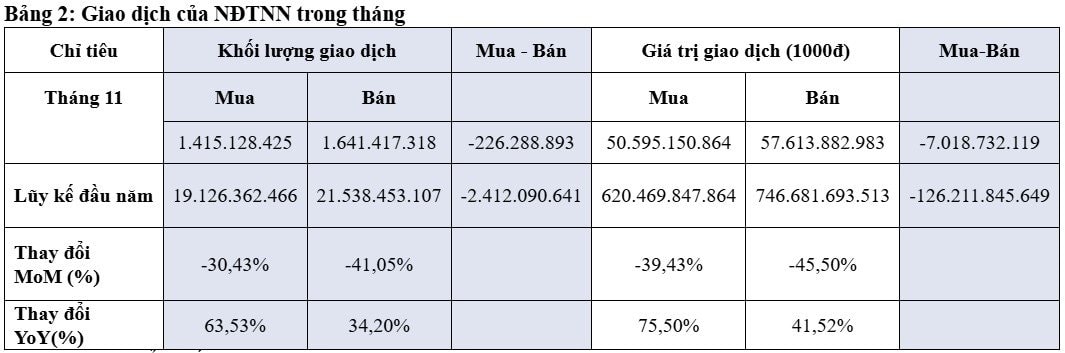 Tổng giá trị giao dịch của nhà đầu tư nước ngoài trong tháng 11/2025 đạt trên 108.209 tỷ đồng, chiếm 11,9% tổng giá trị giao dịch của toàn thị trường. Nhà đầu tư nước ngoài đã thực hiện bán ròng trong tháng với giá trị hơn 7.018 tỷ đồng.