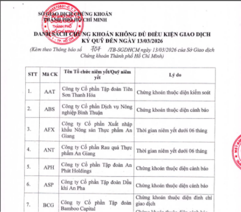 Sở Giao dịch Chứng khoán TP.HCM (HOSE) vừa công bố danh sách 73 cổ phiếu không đủ điều kiện giao dịch ký quỹ (margin) theo các quy định hiện hành. Danh sách lần này ghi nhận sự xuất hiện của một số doanh nghiệp có quy mô lớn trên thị trường, đồng thời bao gồm nhiều mã cổ phiếu mới niêm yết hoặc đang thuộc diện cảnh báo, kiểm soát.