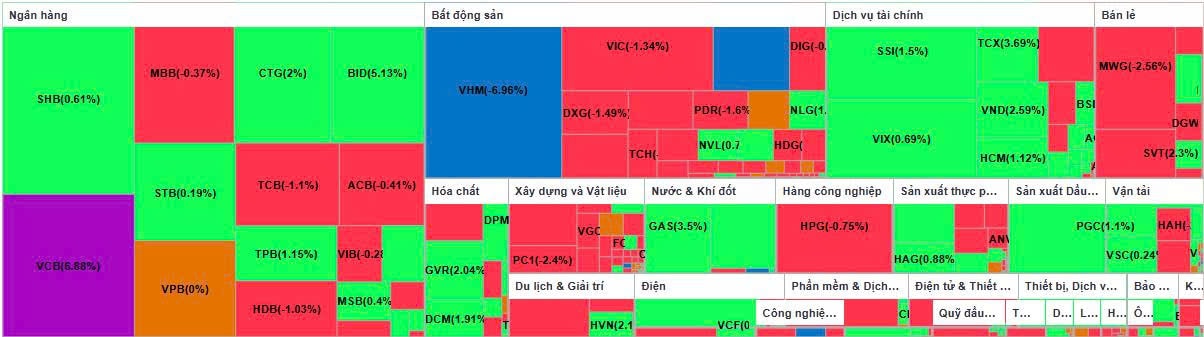 Ở chiều ngược lại, nhóm ngân hàng tiếp tục đóng vai trò trụ đỡ chính của thị trường. Nổi bật nhất là VCB khi tăng kịch trần gần 7%, đóng góp hơn 7 điểm cho chỉ số chung.