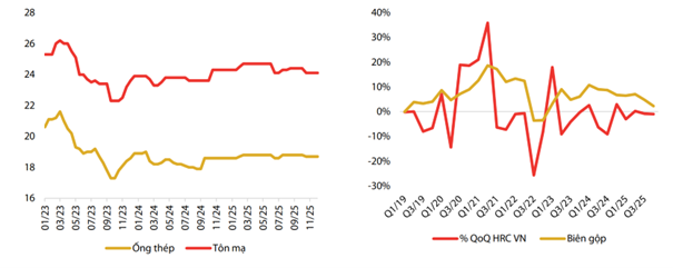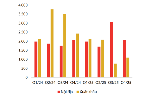 Diễn biến bán hàng cũng cho thấy tín hiệu kém tích cực. Doanh thu nội địa giảm mạnh theo quý, trong khi xuất khẩu dù cải thiện so với quý trước nhưng vẫn thấp hơn nhiều so với cùng kỳ năm trước. Tổng tiêu thụ tôn mạ trong các tháng cuối năm giảm 13–16% so với cùng kỳ, chịu tác động từ các biện pháp bảo hộ thương mại và thời tiết bất lợi.