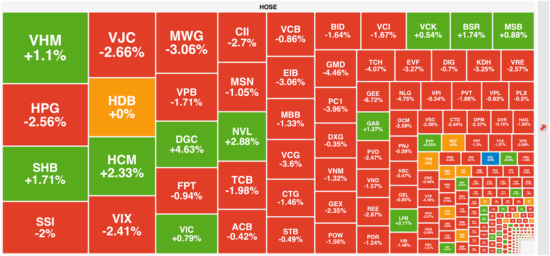 Kết thúc phiên giao dịch hôm nay, sàn HOSE có 78 mã tăng và 233 mã giảm, VN-Index giảm 10,78 điểm (-0,64%), xuống 1.684,04 điểm. Tổng khối lượng giao dịch đạt hơn 772,3 triệu đơn vị, giá trị đạt 21.128,9 tỷ đồng, giảm 13% về khối lượng và 23% về giá trị so với phiên hôm qua. Giao dịch thỏa thuận đóng góp hơn 75,4 triệu đơn vị, giá trị đạt 2.259 tỷ đồng.