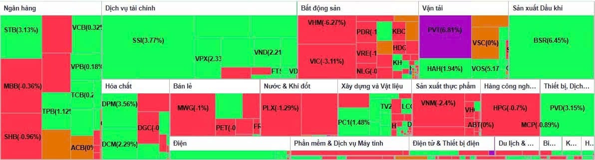 Các nhóm ngành từng bứt phá mạnh trong phiên trước như năng lượng, dầu khí, vận tải và phân bón vẫn duy trì sắc xanh nhưng đà hưng phấn đã hạ nhiệt. Một số mã như TDG, PMT, PVT tiếp tục tăng trần.