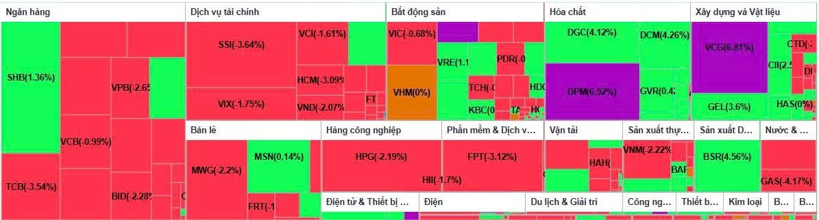 Cổ phiếu ngân hàng và chứng khoán cũng lùi bước mạnh hơn trong phiên chiều. SSI giảm 3,6%, TCB mất 3,5%, VPB giảm 2,6%, còn TPB, BID, CTG, VIB và MBB đều giảm trên 2%.