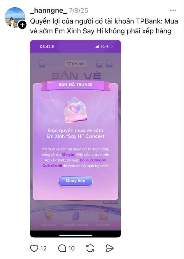 Chỉ với vài thao tác trên App TPBank, khách hàng đã có thể tham gia quay số và “ẵm” ngay cơ hội sở hữu tấm vé concert Em Xinh “Say Hi” miễn phí.