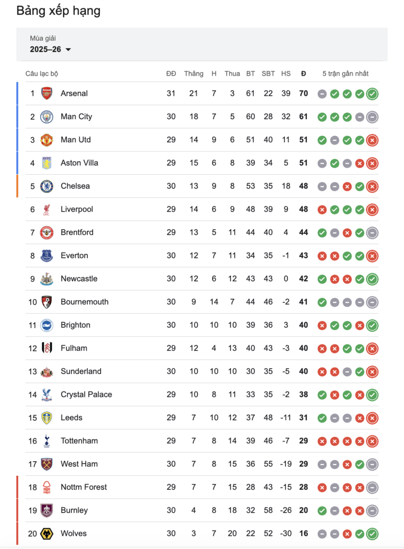 Ở khu vực giữa bảng xếp hạng, các đội như Brentford, Everton hay Bournemouth đang duy trì vị trí tương đối an toàn. Trong khi đó, cuộc chiến trụ hạng vẫn duy trì sức nóng khi các đội cuối bảng như Burnley và Wolverhampton Wanderers vẫn đang chật vật tìm điểm số để thoát khỏi khu vực nguy hiểm.