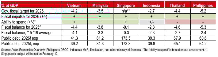 Các chuyên gia HSBC nhận định, với tỷ lệ nợ công trên GDP thấp, Việt Nam và Indonesia đang tập dượt để bồi đắp sức mạnh tài khóa trong năm 2026, tích lũy thâm hụt tài khóa vượt mức bình quân trước đại dịch. Việt Nam sẵn sàng thúc đẩy chi tiêu cho hạ tầng bởi Việt Nam đang triển khai kế hoạch cải tổ rộng khắp với mục tiêu tỷ lệ thâm hụt tài khóa trên GDP nhỉnh hơn mức khoảng 4,1% trước đại dịch.