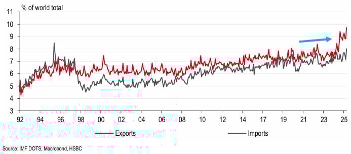 Biểu đồ 3: Thị phần xuất khẩu toàn cầu của ASEAN tăng đáng kể giai đoạn 2024-2025 trong khi nhập khẩu không tăng nhiều