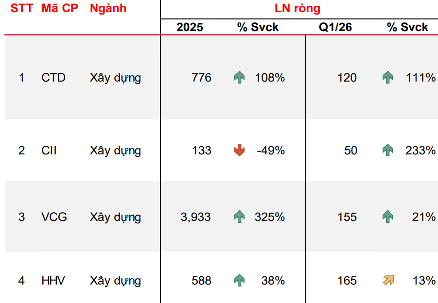 Theo đó, lợi nhuận ròng quý I/2026 dự báo tăng trưởng mạnh mẽ nhất đến từ Công ty CP Xây dựng Coteccons (CTD) và Công ty CP Đầu tư Hạ tầng Kỹ thuật TP. Hồ Chí Minh (CII) với mức tăng lần lượt là 111% và 233% so với cùng kỳ. Trong khi Tổng Công ty Cổ phần Xuất nhập khẩu và Xây dựng Việt Nam (Vinaconex, VCG) và Công ty CP Đầu tư hạ tầng giao thông Đèo Cả (HHV) có thể đạt mức tăng 21% và 13% so với cùng kỳ.