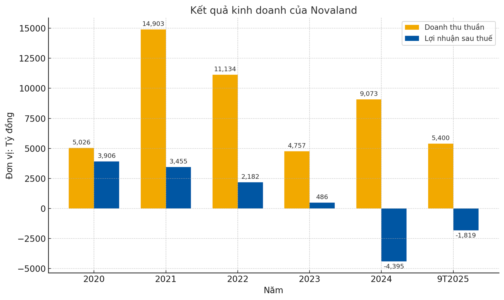 Theo báo cáo phân tích của HSC, Novaland được dự báo có thể ghi nhận lỗ sau thuế khoảng -1.515 tỷ đồng trong năm 2025, đây là mức lỗ sâu hơn nhiều so với cả hai phương án mà doanh nghiệp đề ra. Doanh thu 2025 được HSC ước tính đạt khoảng 7.120 tỷ đồng, thấp hơn đáng kể so với mức 10.453–13.411 tỷ đồng trong kế hoạch của Novaland.