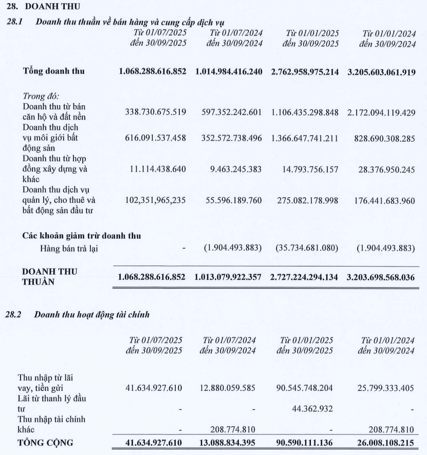 Ngược lại, doanh thu từ chuyển nhượng bất động sản giảm 43%, còn khoảng 339 tỷ đồng, phản ánh sự điều chỉnh chiến lược của doanh nghiệp khi tập trung hơn vào mảng dịch vụ và môi giới - lĩnh vực có biên lợi nhuận cao hơn.