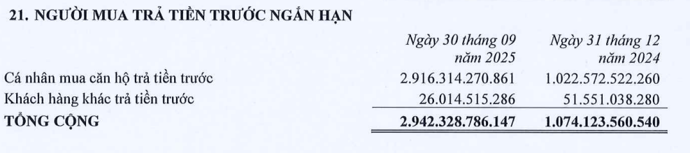Đáng chú ý, tính đến cuối quý 3/2025, DXG ghi nhận hơn 2.900 tỷ đồng tiền cá nhân mua căn hộ trả trước, gấp gần 3 lần đầu năm và tăng hơn 70% so với quý trước. Tổng giá trị người mua trả tiền trước đạt 2.942 tỷ đồng, tăng gần 3 lần so với đầu năm (1.074 tỷ đồng).