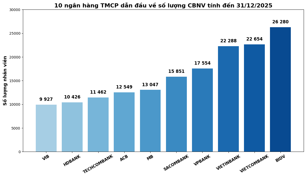 Ngoài nhóm Big4, nhiều ngân hàng thương mại cổ phần cũng duy trì lực lượng lao động trên 10.000 người như VPBank, Sacombank, MB, ACB, Techcombank và HDBank. Ở chiều ngược lại, một số ngân hàng có quy mô nhân sự dưới 2.000 người gồm Saigonbank, BaoViet Bank, Viet A Bank và PGBank.