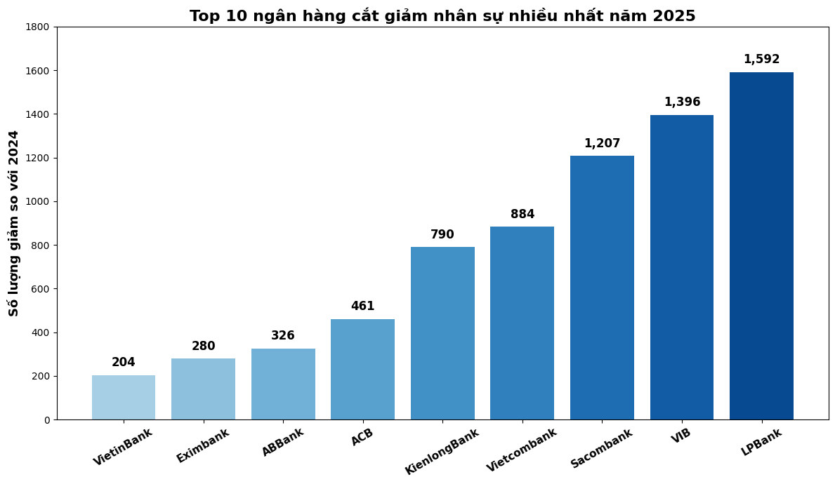 Năm 2025 ghi nhận những biến động đáng chú ý về nhân sự trong ngành ngân hàng khi có tới 15/28 ngân hàng thương mại trong nước cắt giảm lao động so với năm trước. Đáng chú ý, hai ngân hàng thuộc nhóm Big4 là Vietcombank và VietinBank cũng xuất hiện trong danh sách này. Ba ngân hàng có mức cắt giảm mạnh nhất gồm LPBank, VIB và Sacombank.