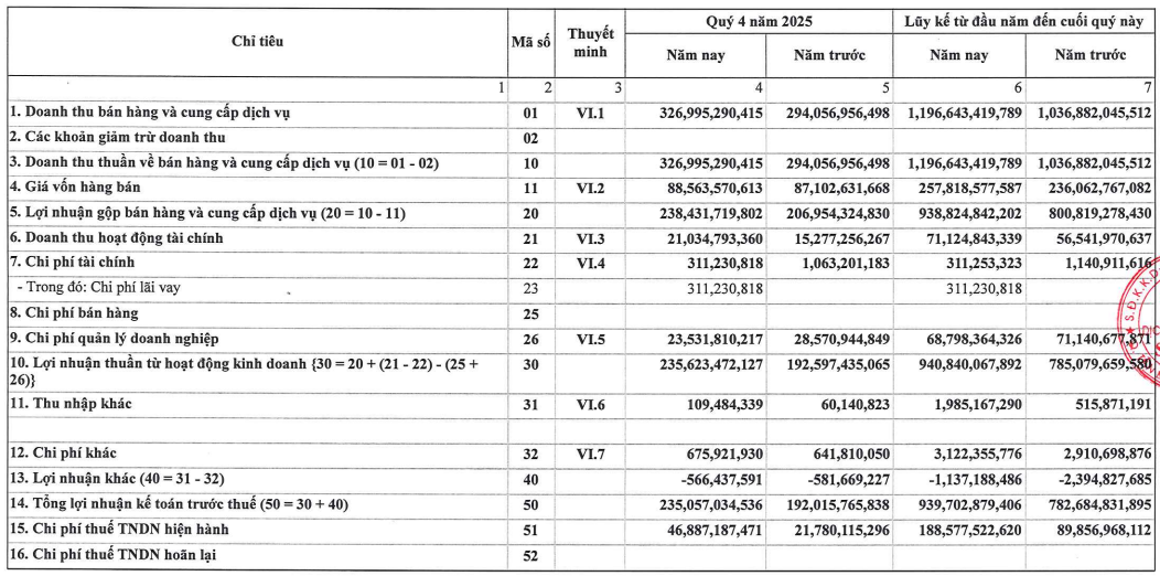 Ở chiều lợi nhuận, lợi nhuận sau sau lợi ích cổ đông thiểu số trong quý IV đạt 188 tỷ đồng, giảm 8% so với quý III nhưng vẫn tăng 11% so với cùng kỳ. Nguyên nhân chính khiến lợi nhuận giảm theo quý không đến từ hoạt động kinh doanh cốt lõi, mà chủ yếu xuất phát từ chi phí tăng mạnh trong giai đoạn cuối năm.