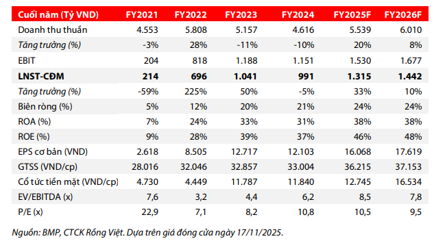 Trong báo cáo cập nhật tháng 11/2025, Công ty Chứng khoán Rồng Việt (VDSC) tiếp tục đưa ra khuyến nghị TÍCH LŨY đối với cổ phiếu Công ty CP Nhựa Bình Minh (BMP), với giá mục tiêu 168.100 đồng/cp, tương ứng mức tăng 11%. Đặc biệt Nhựa Bình Minh dự kiến chia cổ tức tiền mặt 12.700 đồng năm 2025 và 16.500 đồng năm 2026, đưa BMP vào nhóm cổ phiếu phù hợp với chiến lược đầu tư cổ tức dài hạn.