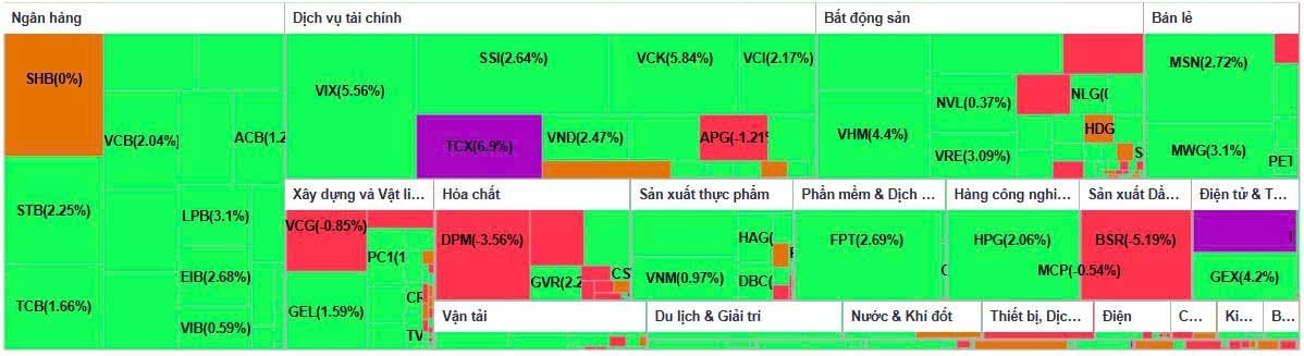 Bên cạnh đó, LPB và MWG cũng tăng hơn 3%, lên lần lượt 43.300 đồng và 83.100 đồng/cổ phiếu. Nhiều mã lớn khác như VCB, HPG, MBB, STB, GVR, SSI, FPT và MSN cùng tăng từ 2% đến gần 3%, qua đó góp phần giữ nhịp đi lên của chỉ số.