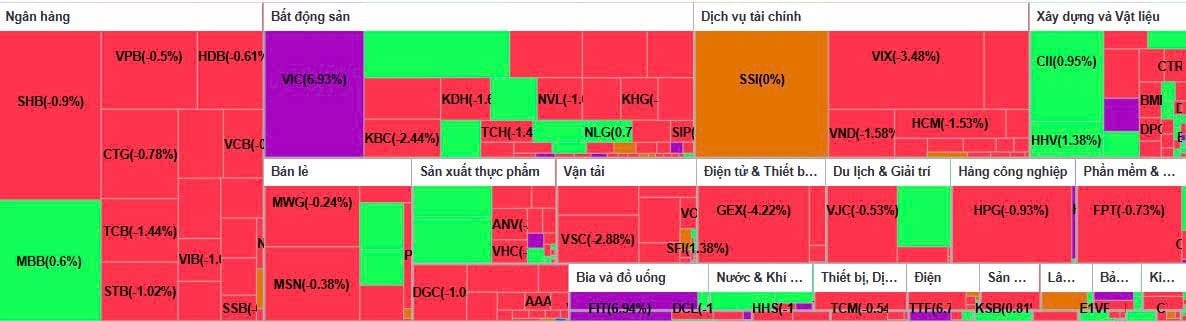 Nhóm chứng khoán chìm trong sắc đỏ khi nhiều mã đồng loạt giảm trên 1%. VIX chịu áp lực mạnh nhất khi mất 3,5%, xuống 23.550 đồng/cổ phiếu với thanh khoản hơn 31 triệu đơn vị. Ở nhóm thép, HPG đảo chiều giảm 0,9% và đóng cửa tại mức thấp nhất phiên, đạt 26.750 đồng/cổ phiếu.