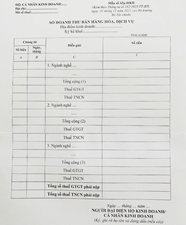 Sổ này được mở để ghi doanh thu bán hàng hóa, dịch vụ theo từng nhóm danh mục ngành nghề kinh doanh có cùng tỷ lệ % để tính thuế GTGT hoặc cùng mức thuế suất để tính thuế TNCN. Trường hợp hộ kinh doanh, cá nhân kinh doanh có nhiều nhóm ngành nghề khác nhau thì sổ này có thể mở cho từng ngành nghề có cùng tỷ lệ % để tính thuế GTGT hoặc cùng mức thuế suất để tính thuế TNCN. Trường hợp cơ quan thuế cung cấp dữ liệu nộp thuế GTGT, thuế TNCN thì hộ kinh doanh, cá nhân kinh doanh sử dụng sổ này để theo dõi, đối chiếu số thuế GTGT, thuế TNCN phải nộp với cơ quan thuế.