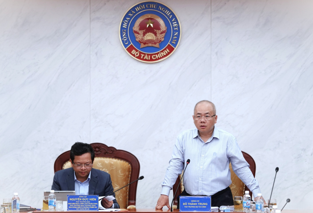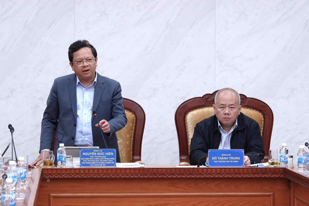 margin: 15px auto;" />Thứ trưởng Bộ Tài chính Đỗ Thành Trung và ông Nguyễn Đức Hiển, Phó Trưởng Ban Chính sách, chiến lược Trung ương, Phó Trưởng ban Thường trực Ban Chỉ đạo đồng chủ trì buổi làm việc. Cùng tham dự buổi làm việc có đại diện các đơn vị chuyên môn Ban Chính sách, chiến lược Trung ương; đại diện các Bộ, ngành và các đơn vị thuộc Bộ Tài chính.