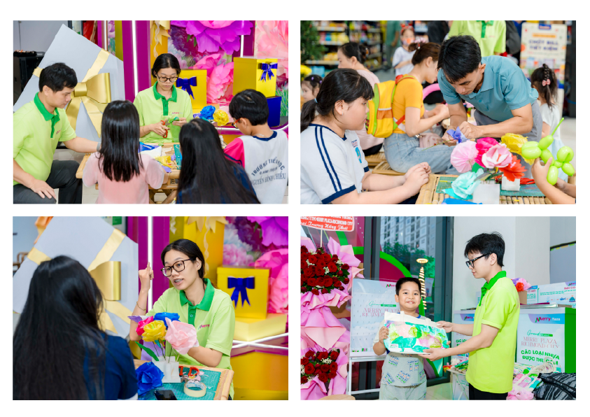 Trong 4 ngày khai trương, các workshop tái chế luôn rộn rã với tiếng cười của trẻ nhỏ và niềm háo hức của các gia đình trẻ. Ai cũng hào hứng thử sức với vật liệu tái chế, vừa sáng tạo vừa trải nghiệm những khoảnh khắc vui vẻ bên nhau, lan tỏa thông điệp sống xanh gần gũi.