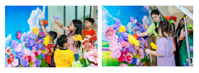 Sau khi được các nghệ nhân khiếm thính hướng dẫn làm hoa tái chế, các bạn nhỏ sẽ được cắm bông hoa đã tự tay làm lên bức tường hoa tại Merry Plaza Richmond City.
