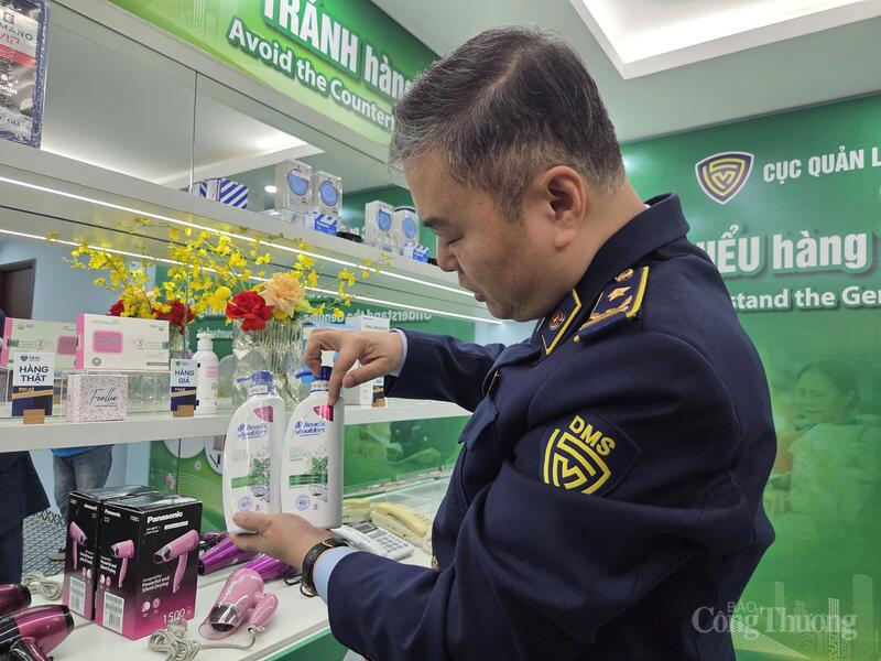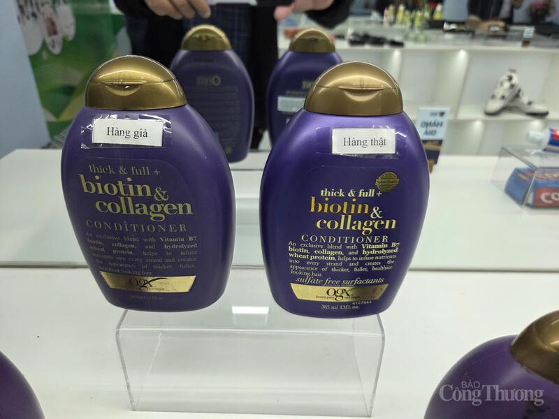 Ông Nguyễn Đức Lê, Phó Trưởng phòng Nghiệp vụ Quản lý thị trường, Cục Quản lý và Phát triển thị trường trong nước (Bộ Công Thương) hướng dẫn cách phân biệt 2 chai dầu gội thật và giả điều dễ nhận thấy nhất là màu sắc hàng thật đậm và sắc nét hơn trên bao bì sản phẩm.