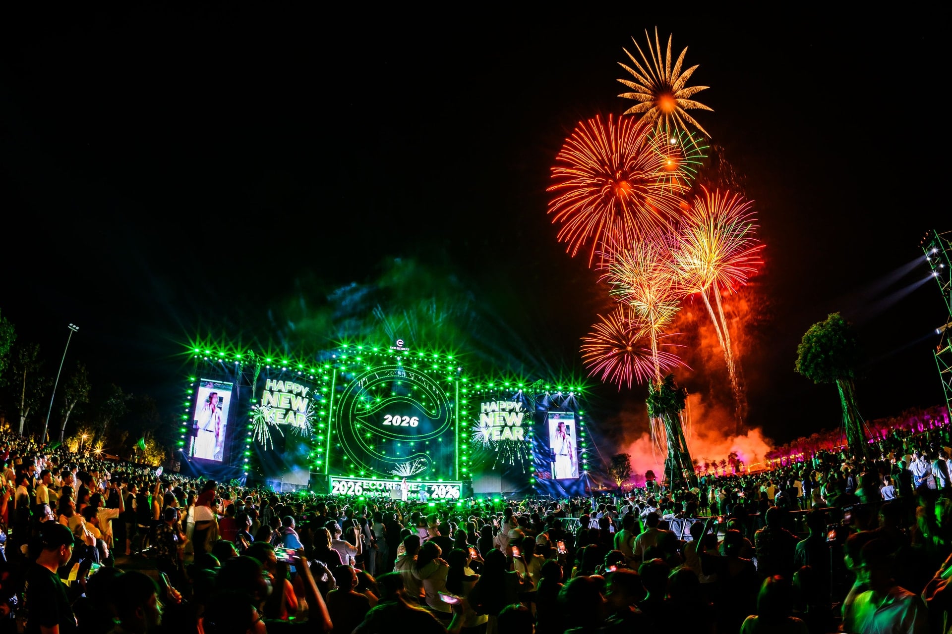 Không gian sân khấu Eco Retreat Countdown được dàn dựng công phu, hiện đại. Sự góp mặt của nhiều nghệ sĩ được yêu thích như Uyên Linh, Tăng Phúc, Ricky Star, Phạm Đình Thái Ngân, Phạm Lịch… đã mang đến những màn trình diễn sôi động, thăng hoa, khuấy động gần 40 nghìn khán giả có mặt tại sự kiện. Trong thời khắc chuyển giao sang năm mới, màn pháo hoa rực rỡ trên bầu trời đã tạo nên những khoảnh khắc đầy cảm xúc, khó quên cho cả người dân lẫn du khách.