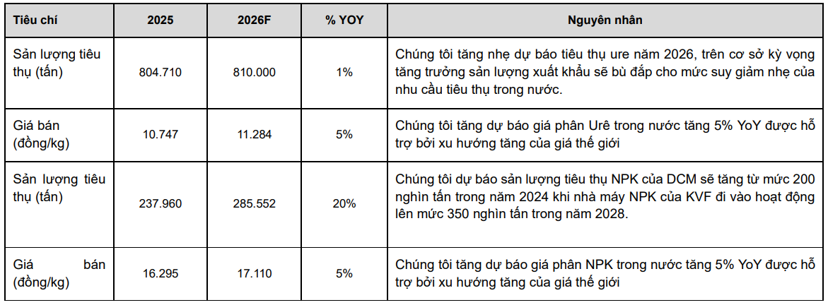 Một số động lực vận hành đáng chú ý gồm sản lượng urê tiêu thụ dự kiến tăng nhẹ lên khoảng 810.000 tấn, trong khi giá bán bình quân có thể tăng khoảng 5%. Với NPK, sản lượng được kỳ vọng tăng mạnh 20% khi nhà máy đi vào hoạt động ổn định hơn. Việc tăng trưởng đồng thời cả sản lượng lẫn giá bán được xem là yếu tố quan trọng giúp duy trì đà cải thiện lợi nhuận.