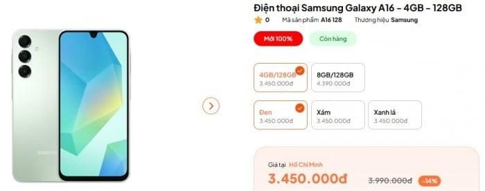 Hiện tại, Galaxy A16 4G đang được bán chính hãng với giá khoảng 3,45 triệu đồng cho bản 4GB RAM/128GB bộ nhớ trong và khoảng 4,39 triệu đồng cho phiên bản 8GB RAM/128GB.