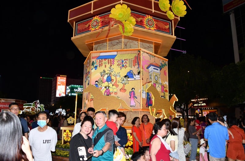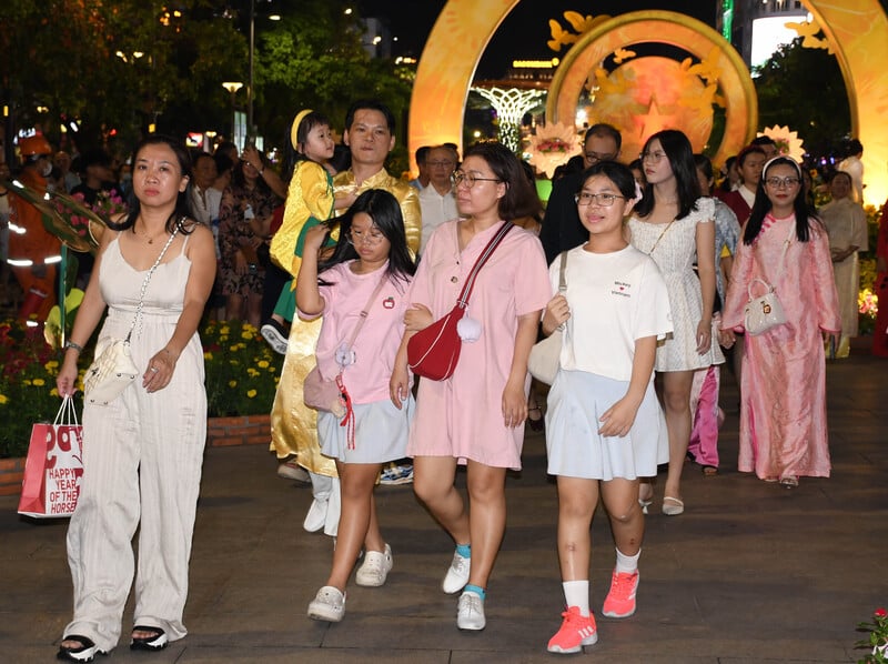 Đường hoa Nguyễn Huệ Tết Bính Ngọ phục vụ người dân tham quan, thưởng ngoạn đến 21 giờ ngày 22/2/2026 (mùng 6 tết Bính Ngọ). Ảnh: Minh Khuê.