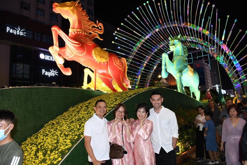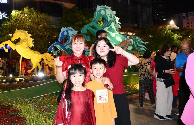 Linh vật ngựa đường hoa Nguyễn Huệ là tâm điểm được các gia đình lựa chọn chụp hình. Ảnh: Minh Khuê.