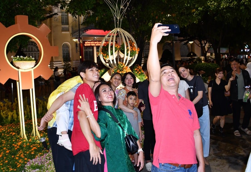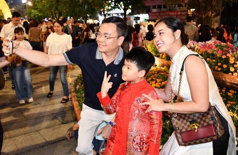 Người dân rất phấn khởi khi là những người đầu tiên được vào tham quan đường hoa Nguyễn Huệ sau lễ khai mạc tối ngày 15/2 (28 Tết). Ảnh: Minh Khuê.