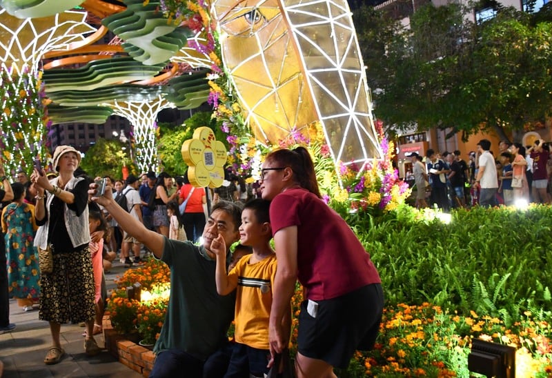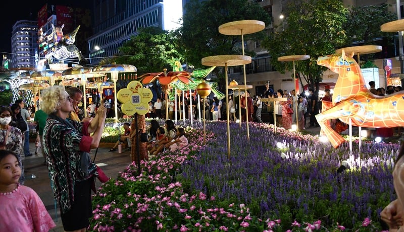 Nhiều khách du lịch quốc tế háo hức với đường hoa Nguyễn Huệ dịp Tết cổ truyền. Ảnh: Minh Khuê.