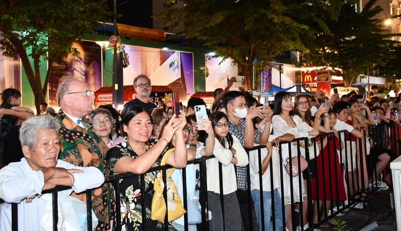 Một gia đình lưu giữ những khoảnh khắc đẹp ngay trong đêm khai mạc. Ảnh: Minh Khuê.