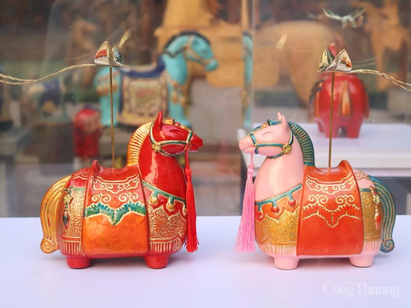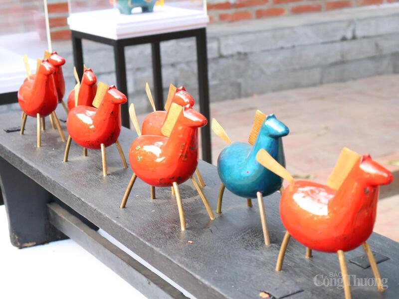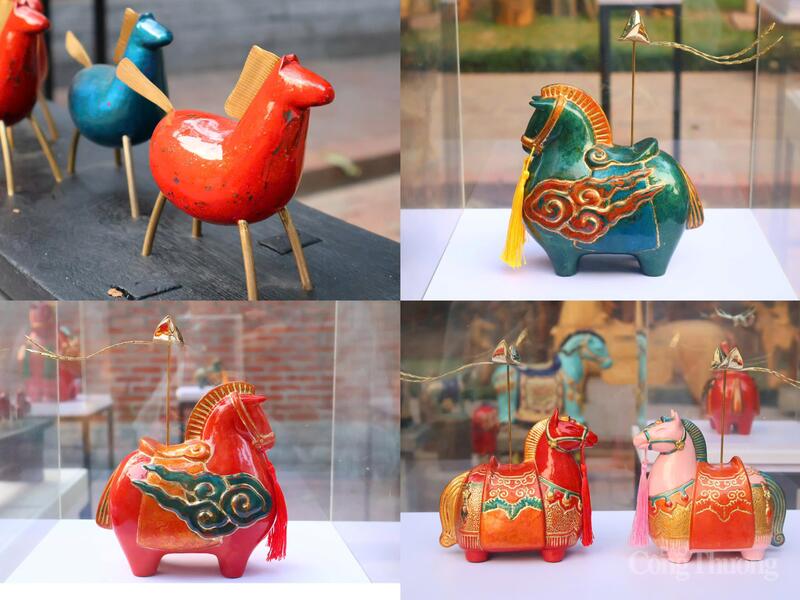 Đáng chú ý, tác phẩm sơn mài "Ngựa hoa mai" rực rỡ tượng trưng cho sự sung túc; tác phẩm "Hí hí" kết hợp cốt gỗ và đồng, mang âm hưởng vui tươi của ngày Tết.