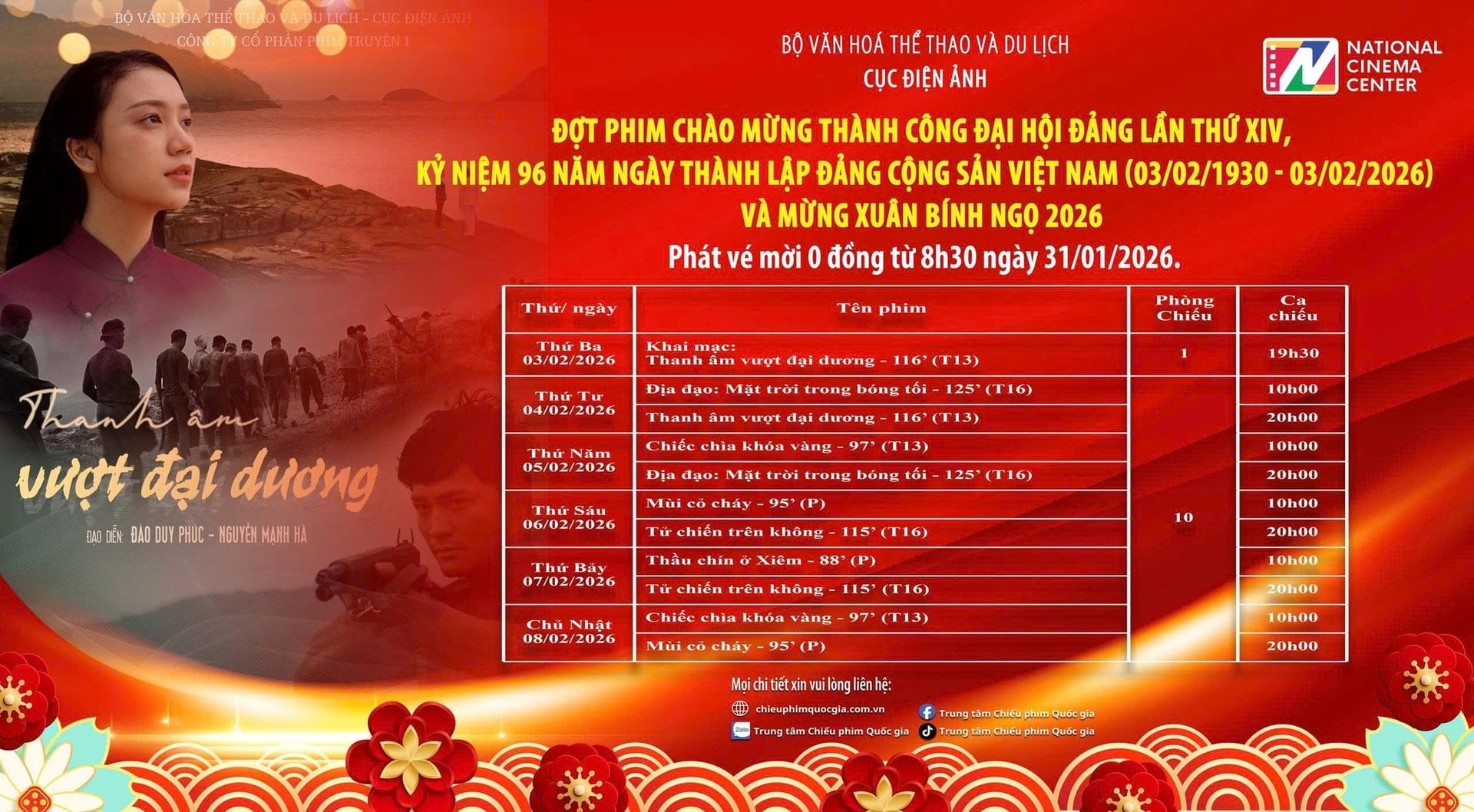 Chương trình phim chiếu trong Đợt phim tại Trung tâm Chiếu phim Quốc gia bao gồm các phim truyện: Thanh âm vượt đại dương, Tử chiến trên không, Địa đạo - Mặt trời trong bóng tối, Chiếc chìa khóa vàng, Mùi cỏ cháy, Thầu Chín ở Xiêm. Trung tâm Chiếu phim Quốc gia sẽ phát vé mời 0đ tới các khán giả xem các bộ phim trên từ 8h30 ngày 31/01/2026.