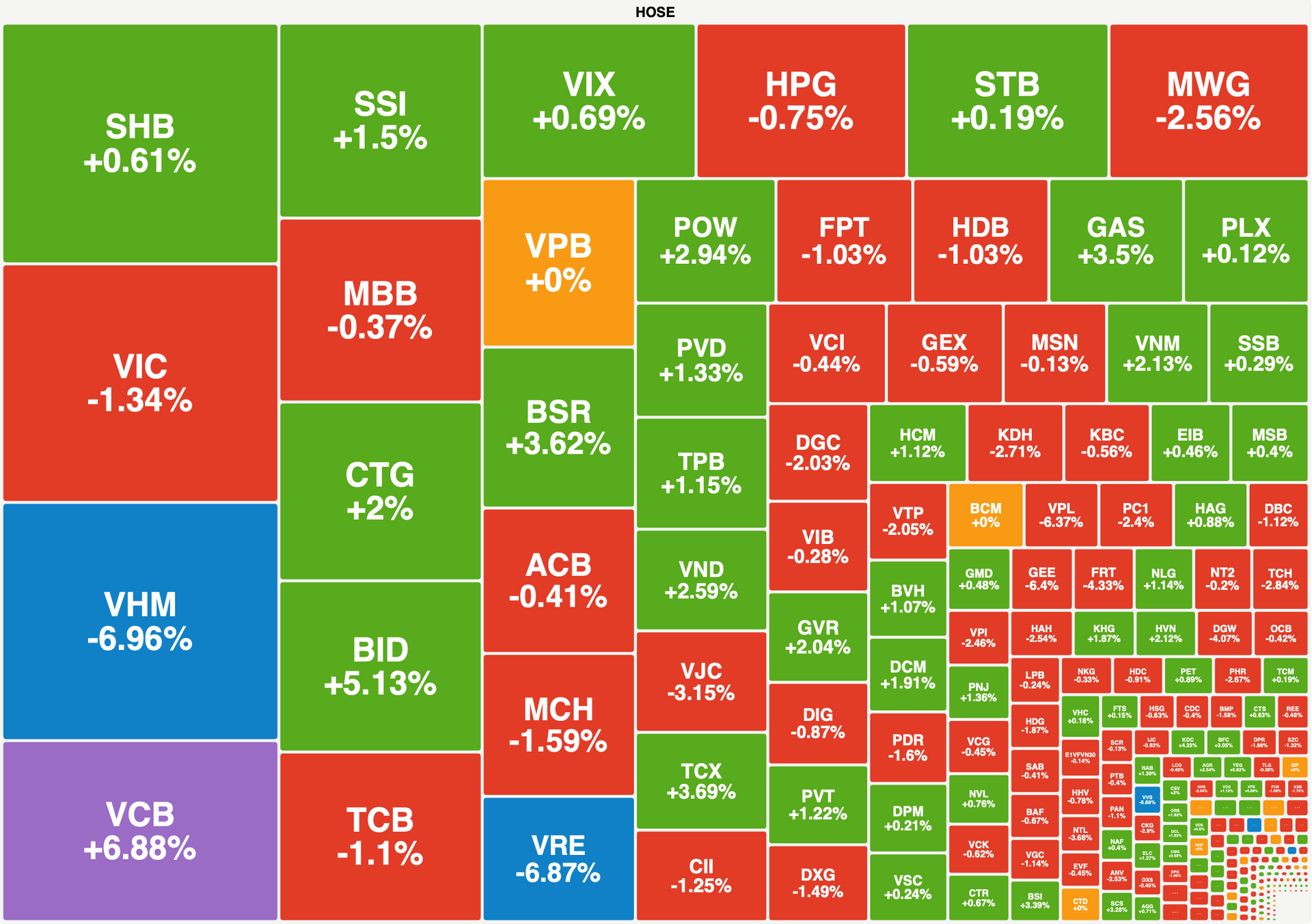 Xét về nhóm ngành, cổ phiếu ngân hàng là trụ đỡ chính của thị trường, đặc biệt là VCB đã đóng góp tới hơn 7 điểm cho VN-Index. Kết phiên, VCB tăng 6,9% với thanh khoản lên tới hơn 27,1 triệu đơn vị.
