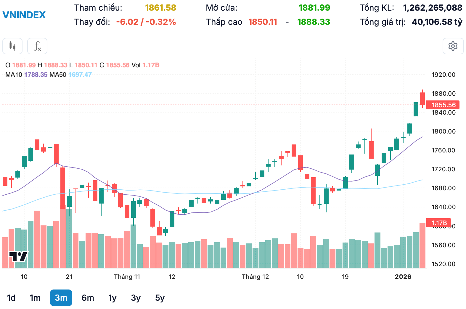 margin: 15px auto;" />Thị trường chứng khoán hôm nay mở cửa trong trạng thái hưng phấn sau 2 phiên tăng mạnh trước đó. Chỉ số chung bật tăng hơn 20 điểm ngay từ đầu phiên, vươn tới cột mốc kỷ lục 1888.33 điểm. Sự cộng hưởng từ VIC và các mã blue-chips VCB, STB, VNM đã đẩy niềm tin nhà đầu tư lên cao độ. Tuy nhiên, khi "độ cao" đã quá lớn sau nhiều phiên tăng nóng, áp lực chốt lời ngắn hạn bắt đầu bủa vây, kéo chỉ số lùi sát về tham chiếu ngay trước giờ nghỉ trưa trong sự thận trọng của dòng tiền.
