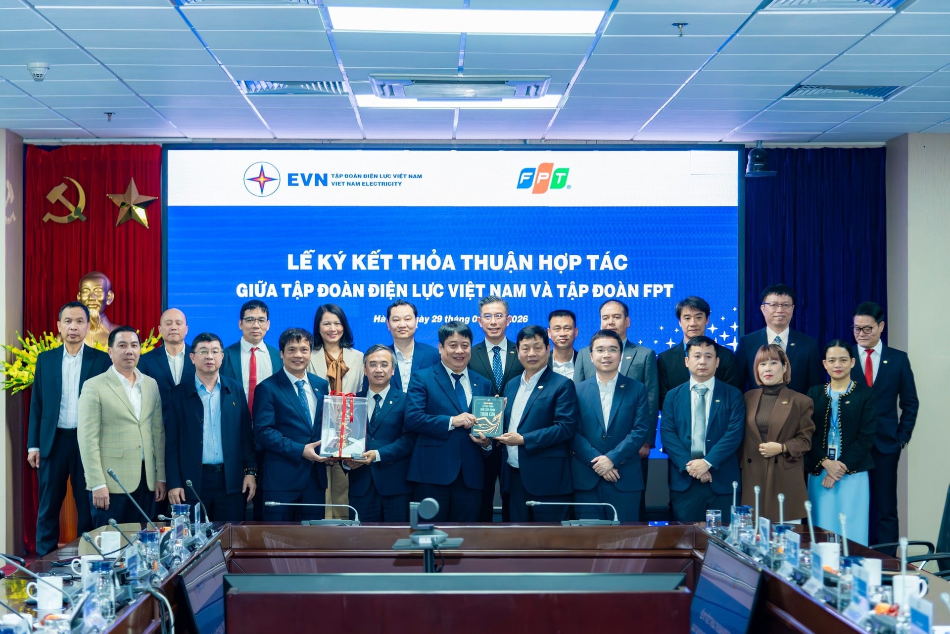 margin: 15px auto;" />Lễ ký kết có sự tham dự của lãnh đạo cấp cao hai tập đoàn. Về phía EVN là Tổng giám đốc Nguyễn Anh Tuấn cùng các thành viên Hội đồng Thành viên, Ban Tổng giám đốc và lãnh đạo các ban chuyên môn. Phía FPT có Chủ tịch HĐQT Trương Gia Bình, Tổng giám đốc Nguyễn Văn Khoa và lãnh đạo các đơn vị thành viên. Sự hiện diện đầy đủ của lãnh đạo hai bên cho thấy tính chất chiến lược và cam kết dài hạn của thỏa thuận hợp tác này.