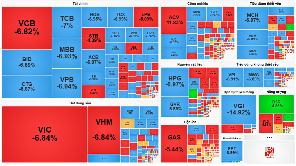 Các nhóm ngành khác hầu như phản ánh sự hoảng loạn của thị trường. Trong nhóm trụ ngành ngân hàng, 3 ông lớn thuộc nhóm Big4 là VCB, BID, CTG đều đồng loạt giảm kịch sản. Những cái tên khác như VPB, MSB, OCB, MBB, … đều không thoát khỏi tình cảnh chung.