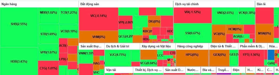 Cùng với đó, nhóm ngân hàng có sự hỗ trợ tích cực, tiêu biểu là HDB tăng 3,4% trong ngày giao dịch không hưởng quyền nhận cổ tức. Các mã STB, TCB và VPB cũng tăng từ hơn 1% đến gần 2%, góp phần nâng đỡ thị trường.