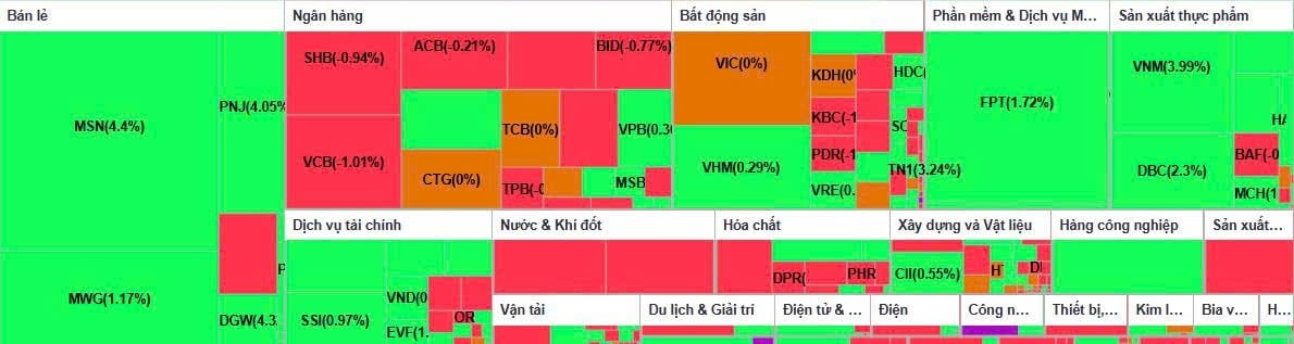 Xét theo ngành, nhóm tiêu dùng tiếp tục là tâm điểm tích cực. Ngoài MSN, nhiều cổ phiếu trong hệ sinh thái Masan ghi nhận mức tăng ấn tượng, từ tăng khá đến tăng trần, góp phần tạo sắc xanh cho thị trường trong bối cảnh chung kém sôi động. Nhóm thép cũng giao dịch khởi sắc nhẹ, với các mã đầu ngành tăng quanh 1% đi kèm thanh khoản ổn định.